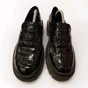 LONDON REBEL Womens (38) 7.5 US Black Patent Penny Loafers Slip On Shoes Punk 90s