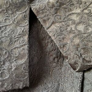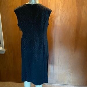 LONDON Style Collection black brocade cocktail dress has rosettes, faux pearls,