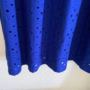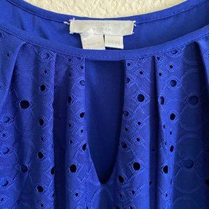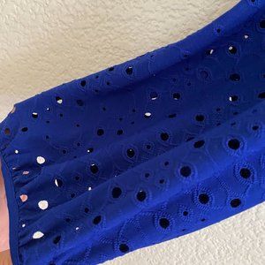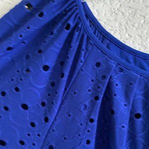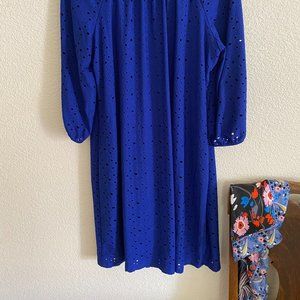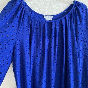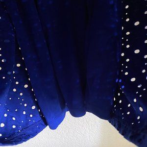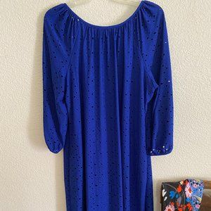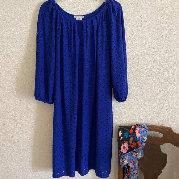 This is a really beautiful easy wear and care LONDON TIMES dress. Body of dress has nylon liner that is the identical color as the outside shell. The 3/4 sleeves are not lined. Color is lovely deeper blue than pictures capture. No damages or flaws. Shell is 92% polyester and 8% spandex. Liner is 100% polyester. Length 39 inches. Underarm-underarm = 21 inches. Washable.