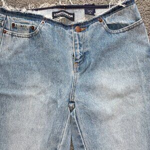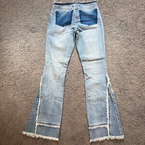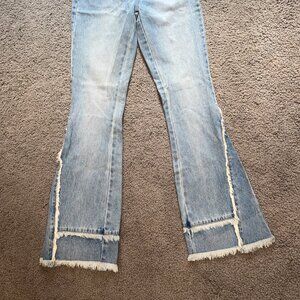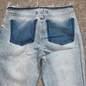 Light wash, raw frayed hems, waist, legs and faded pocket marks.