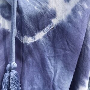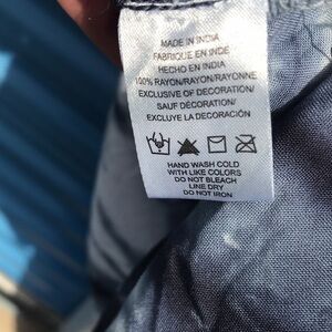 Beautiful summer dress that string ties around the back of your neck has a halter type top., bare back w/elastic across the bottom of back. So lightweight and flowing. 💯 % rayon Very Pretty . The shades of blue are like the ocean and the sky. An Absolute Favorite of mine Its a size small but there is SO MUCH room inside this dress, it always fit me like a size large. Measures across the chest 18 inches and from under the breast to the bottom it is 42 in front And slightly longer in back 47 inches. Around the waist it measures 24 inches.