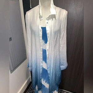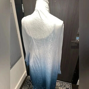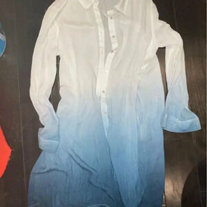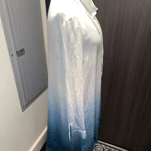Teal and azure blue/ denim blue dip dye button up shirt dress with cuffed long sleeve that can be rolled up with tab. Modest length, relaxing fabric. Wear casual with sandals or with a skinny belt and booties.