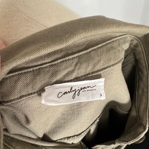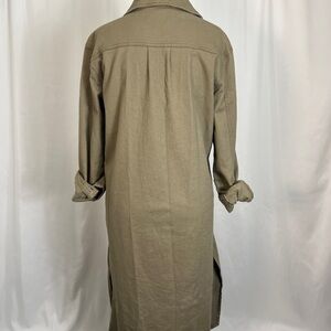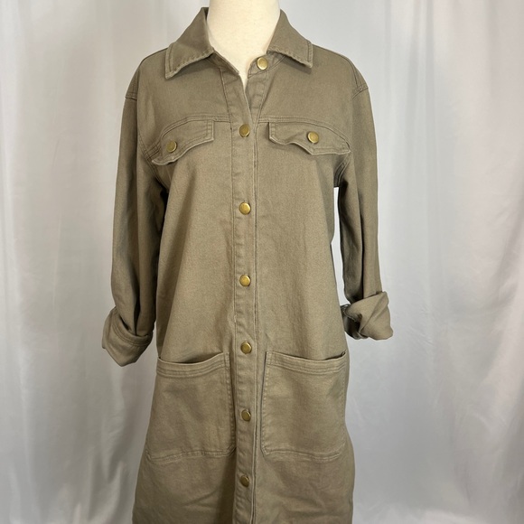 Stylish women's green denim dress featuring elegant gold button accents. Perfect for a chic, casual look. Flexible fabric as well as slits on both sides of the dress for a comfortable and easy to move in fit.