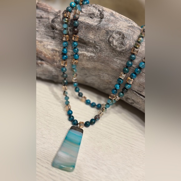 BEAUTIFUL DETAIL BLUE AND CHAMPAGNE COLOR STONES LONG STRAND NECKLACE
