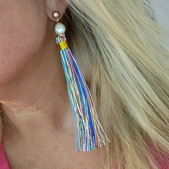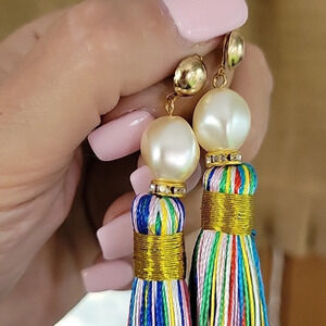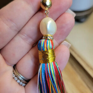 Multicolor dramatic length silk tassels with crystal rondelles that catch the light beneath a pinched faux pearl.