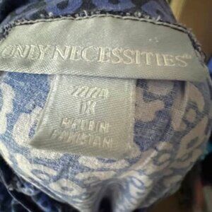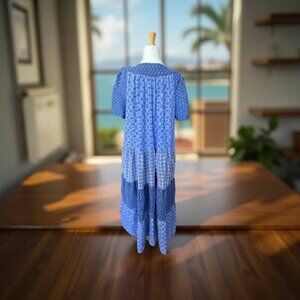 This long multi blue dress in size 22/24 (1X) is both beautiful and comfy, measuring 50 inches in length and 26 inches across the armpits. It’s been loved and worn quite a bit, showing some signs of its adventures, but that only adds to its charm. Perfect for those who appreciate a dress with a story and plenty of style!