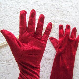 LONG RED GLOVES, M-L, ABOVE-THE-ELBOW SHINY VELOUR: COSTUME, STAGE, SALOON GIRL