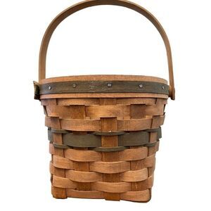 This vintage basket is in good condition. There is one tack missing off of the brass plate on the front (last photo).
