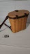 The basket features a hand-woven wood slat design with a solid wood lid. handwoven