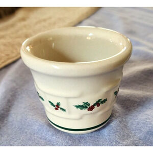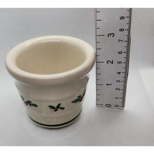 This Longaberger Pottery piece is a small ceramic votive holder. It has small holly leaves and berries around the outside. Could be used as a toothpick holder - perfect for a buffet setting.