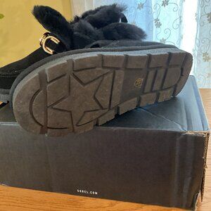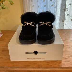 Worn 2x and in excellent like new condition are LONZA PUFF BUCKLE Black Boots/Slippers in black Genuine Suede with Genuine Wool lining. Stylish gold buckle on front. Size 6