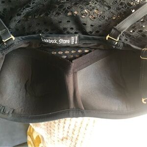 A sexy, padded bustier top is supported by detachable, adjustable straps. Crochet bodice has a fun cutout, and cute cheeky bottom.