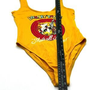 Get ready to turn heads with this vintage Looney Tunes one-piece swimsuit! It features a colorful "That's All Folks" graphic on the front, perfect for any 90s cartoon lover. The wide straps and bikini bottom style make it comfortable to wear while still providing plenty of coverage. This women's medium swimsuit is made of a soft polyester and elastane material, ensuring a comfortable fit. Whether you're hitting the beach or lounging by the pool, this Looney Tunes swimsuit will be a fun and stylish addition to your swimwear collection.