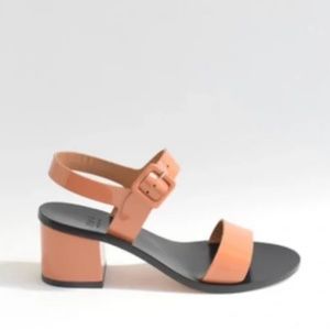 Soft terracotta patent leather open toe sandals. Covered buckle and heel gives this sandal a chic, modern look. Upper leather in very good condition. Soles show wear.