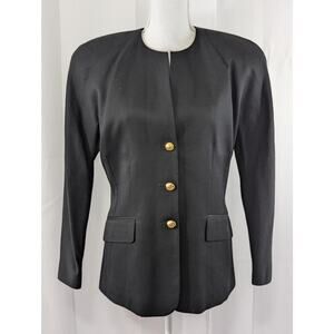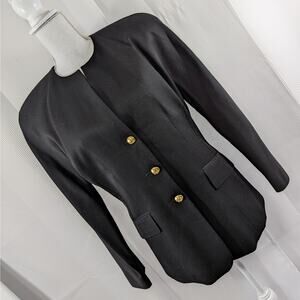 Just a stunning, incredibly classy jacket, blazer, coat, from Lord & Taylor, in finest black wool gabardine! Fully lined, gold club buttons, re front faux pockets, shoulder pads! Excellent flow, drape, Size 10, New! Never Worn!