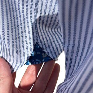 Inner fabric at neck and cuffs is dark blue dobby weave with a tiny square texture