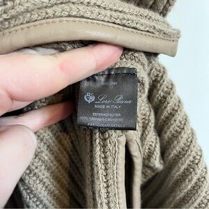 LORO PIANA 100% Cashmere Ribbed Cowl Neck Short Sleeve Sweater. Indulge in understated luxury with this authentic Loro Piana short-sleeve tunic sweater, crafted in Italy from ultra-soft 100% cashmere. This ribbed knit piece features a voluminous cowl neckline, side slits for ease of movement, and luxe lamb leather trim detailing along the side slits. Subtle metal engraved charm. The neutral taupe color makes it an incredibly versatile layering piece that elevates any outfit. Made in Italy. Ideal for a cozy-chic look styled over leggings or slim trousers. A timeless investment piece from one of Italy’s most prestigious luxury labels. Size 46 = US 12 according to size chart.