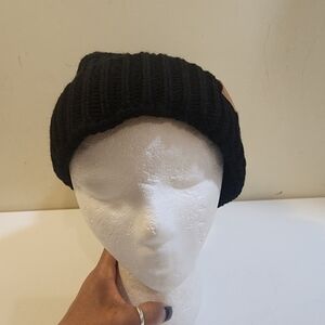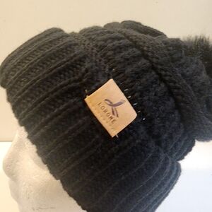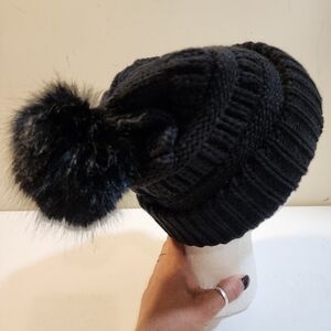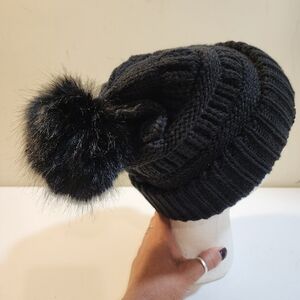 Stylish black ribbed knit beanie with a fluffy pom pom. Perfect for cold weather.