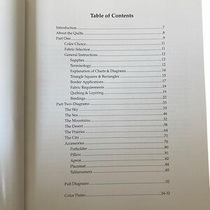 "The" Heavens Above" quilt collection gives you a number of choices. There are two sky variations from which to choose. The placement of the stars and background fabrics create the difference between the two. Either of these sky variations will work with any of the five lower scenes. You will find diagrams of each of the quilts as a whole and separate diagrams of each component section of the skies and scenes. The diagrams of the sections are accompanied by explicit cutting and piecing charts." accessory quilting patterns included