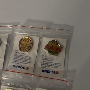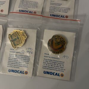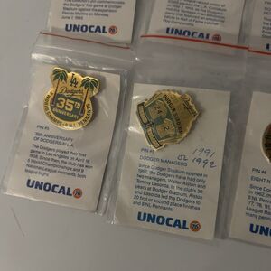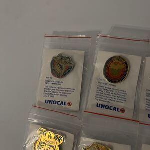 This lot of 6 vintage 1990's Los Angeles Dodgers Unocal 76 lapel pins is a perfect accessory for any baseball fan. Featuring the iconic team colors and logos, these pins are a nostalgic piece of MLB history. Display them proudly on your hat, jacket, or bag to show your support for the Dodgers and commemorate their World Series wins. These one-size pins are a must-have for collectors and fans of the team, making them a great addition to any sports memorabilia collection.
