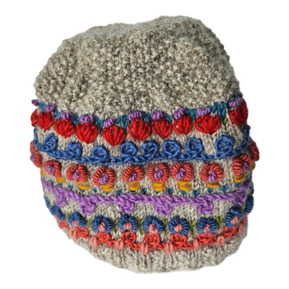 LOST HORIZONS Women's Beanie Hat Hand Knit Wool Nepal Embroidered Fleece Lined