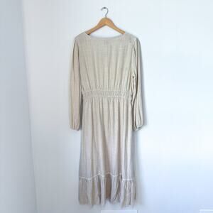 Details: LOST + Wander Square Neck Long Sleeve Maxi Dress - Size: L - Color: Oatmeal - Material: Cotton, viscose, polyester - Features: Long sleeves, square neck, tiered bottom