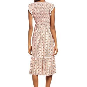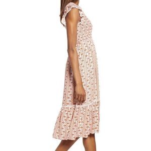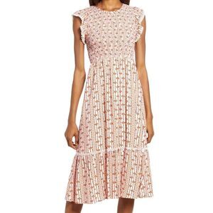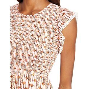 Lost + Wander Flutter Sleeve Midi Dress in bright tangy floral print. Gorgeous jewel neck, ruffled cap sleeves, a Wheatley smocked bodice, and dainty picot trimming at the edges. This long dress will have you looking like the sweetheart you truly are! Women’s size medium.