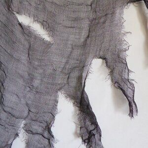 Used, Halloween, black colored, creepy cloth, sheer fabric. There are 6 triangular, distressed pieces, measuring approximately 70” wide by 4 feet long. They have a thin satin cord running the length of the top edge. So they can be hung over windows, doors or mantles They were originally purchased in packages at JoAnn fabrics. They were used twice for indoor holiday decorations. (See photos for details) I am the original owner. It has been in climate controlled storage for years. Comes from a pet and some free home.