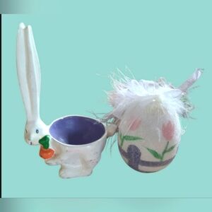 VINTAGE EASTER BUNNY FIGURINES & PINK EASTER EGG HOLDER ~ HAND PAINTED