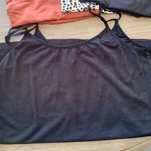 Lot of six women’s tank tops. Three of them have never been worn. Tops from Old Navy, Maurice’s, and one from Walmart. Colors are rust, cheetah, two black, white/black, and sage green.