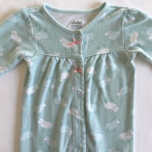 Quality company CARTERS and LITTLE ME baby girl’s 1-piece all-cotton sleep-suits with snaps at neck and bottom. Cute florals with ruffles down front and on sleeves (Little Me) or lamb’s face feet (Carters). All have long sleeves.