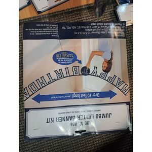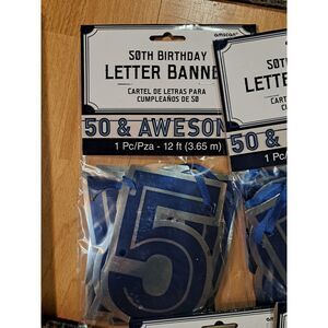 OVERSTOCK Items not sold separately - 17 pounds of fun BIRTHDAY DECOR! Brand New in Packages perfect for surprise party or your own store to sell individually! 16 boxes of 6 (96) "50 & Awesome" 12 foot long - Letters are 5.5 inches tall PLUS 5 Extra Large thick wooden easils signs that can hang or has photo stand behind or lay against an easily 10.5 x 14 inches tall "Happy Birthday to The Man The Myth The Legand" PLUS One Extra Large JUMBO Add an Age Letter Banner kitBanner that has additional numbers plus "Happy Birthday" -10.5 feet long -10 inch letters and numbers.