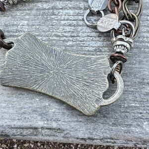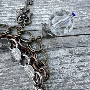 Unique fantasy charm bracelet featuring J.R.R. Tolkien’s “Not All Who Wander Are Lost” quote. Includes mixed metal charms in silver, brass, and bronze tones with glass and gemstone accents. One charm tested as sterling silver with a garnet. Possibly vintage or upcycled from vintage parts. Measures about 9” long. Good pre-owned condition.