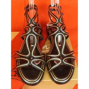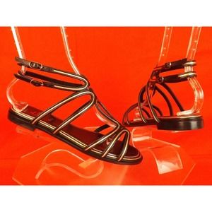 BLACK /GOLD CAGED LEATHER " ZENOSANDY" 2X BUCKLE FLAT ANKLE STRAP SANDALS