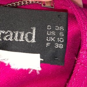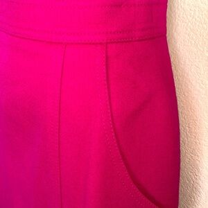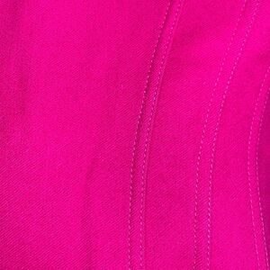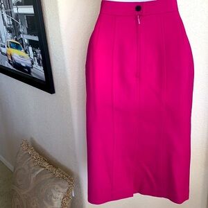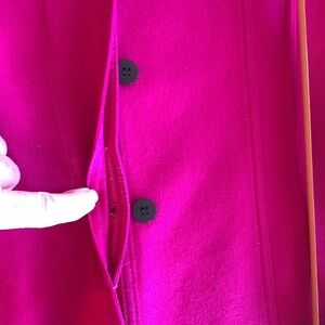 Trophy vintage Louis Feraud wool skirted suit. Hot pink, wool, unlined, flat felled seams throughout. Front panel hides black buttons; side pockets. Padded shoulders —we’re talking big Dynasty-caliber power shoulders. Gorgeous vintage.