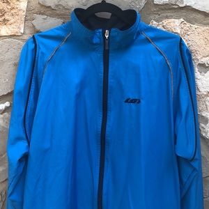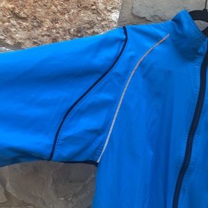 THIS BLUE LOUIS GARNEAU CYCLING JACKET FEATURES BLACK DETAILING THROUGHOUT. IT HAS SILVER REFLECTIVE DETAILING FROM SHOULDER TO PIT ON THE FRONT AND A LARGE ZIPPER POCKET ON THE BACK. IT HAS MESH DETAILING AT THE NAPE OF THE NECK FOR VENTILATION, AND A DOUBLE LAYER OF MESH UNDER UPPER ARMS.