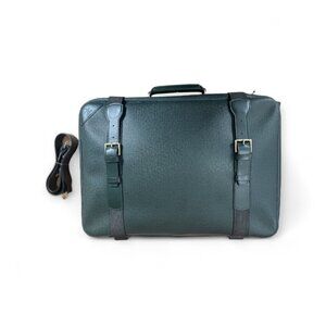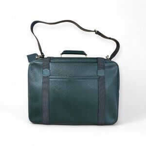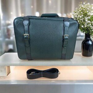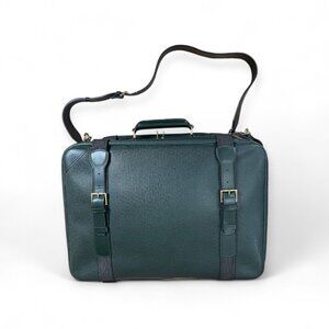 This Louis Vuitton leather carry-on suitcase, crafted from dark green leather, blends rugged durability with timeless style. Measuring 20" L x 7" W x 14" H, it features nylon side straps, a large rear pocket, and a top handle, with an optional shoulder strap for convenience. The interior is lined with matching suede-like microfiber, complete with organizational straps and brass buckle hardware, and includes a flat pocket for extra organization. The suitcase has brass zippers for easy access, a large rear pocket for quick storage, and some light scuffs on the edges that do not detract from its appeal. The interior is clean and well-maintained, and there’s a small unstitched area at the top of the back pocket that doesn’t affect functionality. The hardware has subtle darkening, adding vintage charm, and the base feet and handle show minor surface scuffs. The original metal piping has been removed, enhancing the suitcase’s sleek look. With light creases on the leather straps and slight stretching around the seams, this pre-loved suitcase is in good condition and offers both elegance and practicality for your travels.