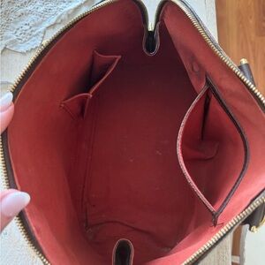 This bag is not brand new and has been used by me. Please review all images and ask questions. There are some markings that could probably be wiped away and internal staining on inner fabric. The bottom is melted a little. There are no cracks or peeling.