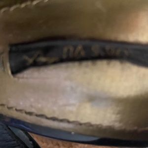 LOUIS VUITTON BLACK DENIM ESPADRILLE WEDGES WITH GOLD BUCKLE.