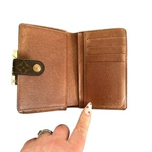 This fabulous French wallet from the house of Louis Vuitton is functional and stylish. It is made from Monogram canvas and lined with leather on the insides. The buttoned closure opens to multiple card slots, open compartments to arrange your cash and it also has a coin pocket that is secured by a kiss lock.