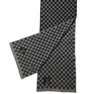 This beautiful Louis Vuitton Black Gray Reversible Cashmere Damier Scarf Pre-Owned is a perfect addition to any fashion-savvy person's wardrobe. Made of high-quality wool, this scarf is a designer piece that will elevate any outfit. The check pattern adds a touch of elegance, while the logo accents give it a subtle luxurious feel.