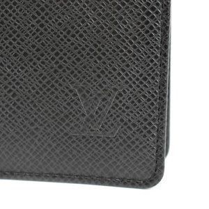 Black, "Taiga" leather folding wallet accented by embossed "LV" logo at bottom corner