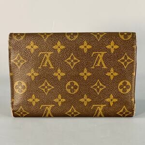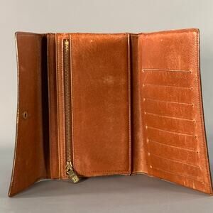 LOUIS VUITTON checkbook wallet in a brown coated canvas featuring brass colored monogram logo pattern, multiple card slots, and flap closure with snap. Made in France.