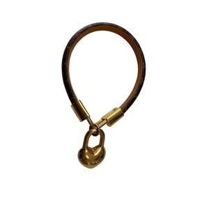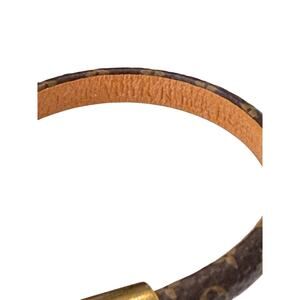This is a pre-loved bracelet. It has LV monogram on the outside of the bracelet. It is leather and gold over brass.