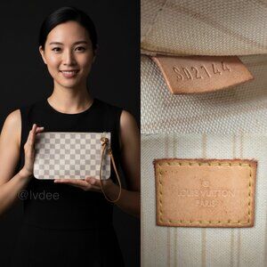 Authentic LV pouch in Damier Azur pattern for the Neverfull bag. Fantastic standalone item that fits phones, wallets, keys, and more. Zippered top closure, natural vachetta leather wristlet, LV engraved clasp. Dual compartment interior.