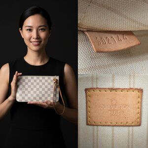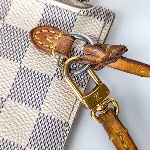LV pouch in Damier Azur pattern that comes with the LV Neverfull bag. Very popular item and great to use anywhere. Zipper closure on top, fts phones, wallets, keys, and more. Natural vachetta leather wristlet, LV engraved clasp. Has main compartment and pocket inside.