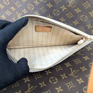 Authentic LV pouch in Damier Azur pattern for the Neverfull bag. Fantastic standalone item that fits phones, wallets, keys, and more. Zippered top closure, natural vachetta leather wristlet, LV engraved clasp. Dual compartment interior.