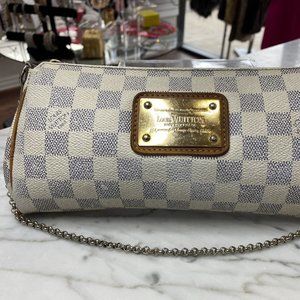 This elegant Louis Vuitton Azur Damier Canvas Eva Clutch Bag is ideal for holding your cosmetics and girly essentials in a fun and elegant manner. The versatility of this handbag this bag even better! It does not include the crossbody strap. Pricing denotes condition, still has tons of life