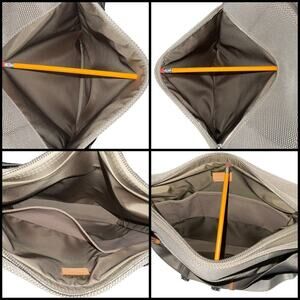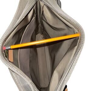 The top zipper opens to a spacious nylon fabric interior with patch pockets.