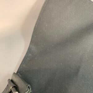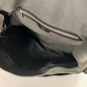 LOUIS VUITTON "Dersou Taiga" messenger bag in a black saffiano leather and green nylon twill featuring adjustable crossbody strap, spacious main interior compartment with pockets, and double silver tone metal toggle closure. Made in France.
